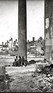 ” In the May 1865, the newspaper covered what Blight argues should be credited as the nation’s first memorial day observance, held on May 1, 1865. At that time, Charleston was largely in ruins and families were eager to rebuild their lives and their city. The photos on this page are Library of Congress images from the era. Two simply show scenes of wartime devastation in the city. But the photo at right here appears to show the land where the former Confederate prison camp stood (also the site of a pre-Civil War Race Course). The photo appears to show work beginning on raising the remains in April 1865 in preparation for the new cemetery that eventually would include a wall, an archway entrance and properly buried remains.