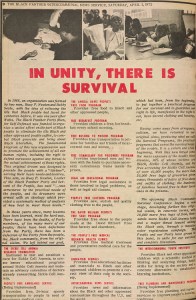 “[W]omen ran the BPP pretty much. I don’t now how it got to be a male’s party or thought of as being a male’s party. Because those things, when you really look at it in terms of society, those things are looked on as being woman things, you know, feeding children, taking care of the sick and uh, so. Yeah, we did that. We actually ran the BPP’s programs.” (Frankye Malika Adams in an interview with Tracye Matthews, 29 September 1994; Harlem, New York)