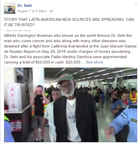 Alfredo Darrington Bowman also known as the world famous Dr. Sebi the man who cures cancer and aids along with many other diseases was detained after a flight from California that landed at the Juan Manuel Galvez de Roatan Airport on May 28, 2016 under charges of money laundering. Dr. Sebi and his associate Pablo Medina Gamboa were apprehended carrying a total of $50,000 in cash. $20,000 on Dr. Sebi and $30,000 on Gamboa. They were attempting to board a private plane headed to another location in Honduras. He was detained and then released for a pending court appearance that would later take place on June 3, 2016.
