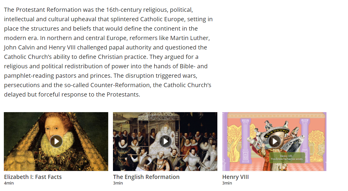 “The Protestant Reformationwas the 16th-century religious, political, intellectual and cultural upheaval that splintered Catholic Europe, setting in place the structures and beliefs that would define the continent in the modern era. In northern and central Europe, reformers like Martin Luther, John Calvin and Henry VIII challenged papal authority and questioned the Catholic Church’s ability to define Christian practice. They argued for a religious and political redistribution of power into the hands of Bible- and pamphlet-reading pastors and princes. The disruption triggered wars, persecutions and the so-called Counter-Reformation, the Catholic Church’s delayed but forceful response to the Protestants.”