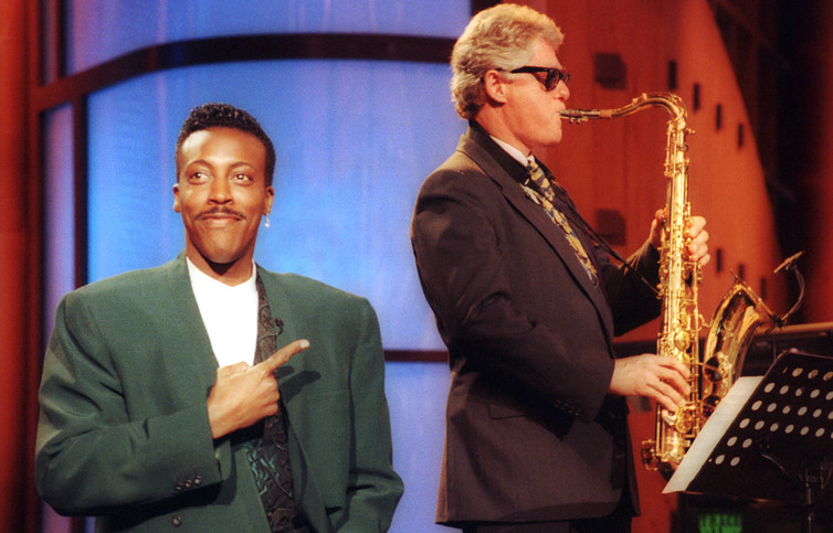 President Bill Clinton plays ‘Heartbreak Hotel’ on his saxophone during an episode of ‘The Arsenio Hall Show’ in 1992.AP Photo/Reed Saxon