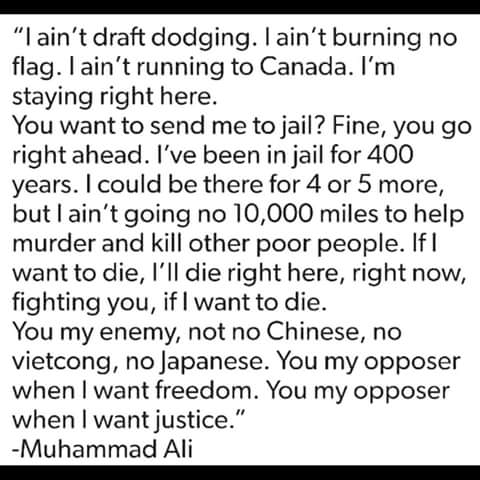 “My conscience won’t let me go shoot my brother, or some darker people, some poor, hungry people in the mud, for big powerful America, and shoot them for what?” Ali said in an interview. “They never called me nigger. They never lynched me. They didn’t put no dogs on me.”