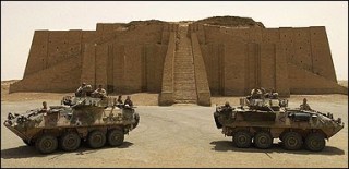 Coalition soldiers in front of the Great Ziggurat of Ur, a four-thousand-year-old temple in southern Iraq which is one of the archaeological treasures of the world. The military has placed the monument off limits in order to disguise the vandalism by U.S. soldiers, including the looting of clay bricks and spray-painting “Semper Fi” onto its walls