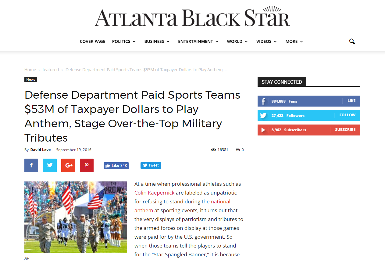 Williams is referring to a 2015 Senate report that detailed the Department of Defense spent $53 million “on marketing and advertising contracts with sports teams between 2012 and 2015.” A huge chunk of that money — $10 million — went toward the NFL. Contracts for “paid patriotism,” as the report referred to the findings, called for national anthem performances, field-sized American flags, on-field color guards and tributes to wounded war heroes. The DOD admitted that the contracts were meant for recruitment, but didn’t indicate how the activities impacted recruitment.